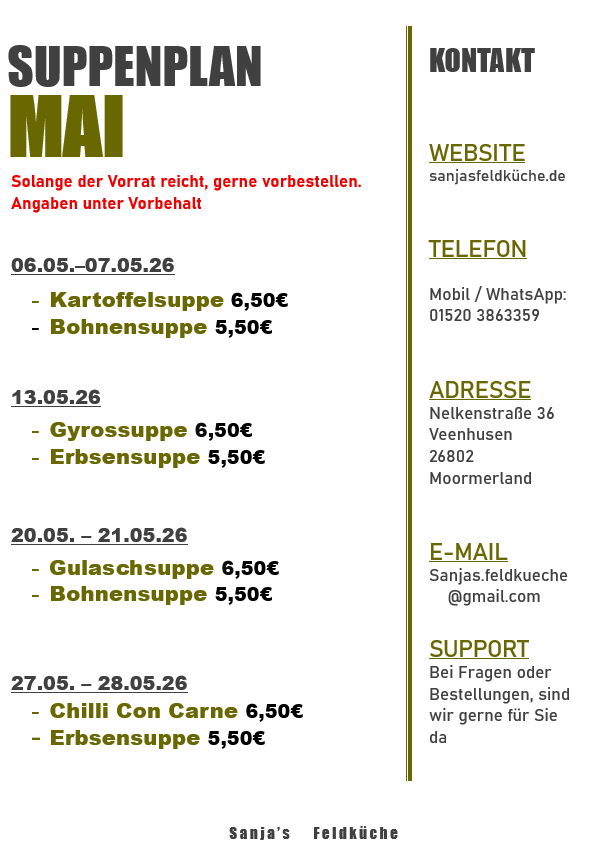 Gerne stellen wir Ihnen den nächsten Suppenplan zur Verfügung.