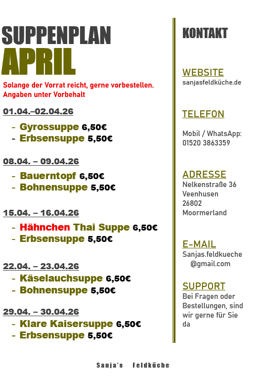 Gerne stellen wir Ihnen den nächsten Suppenplan zur Verfügung.